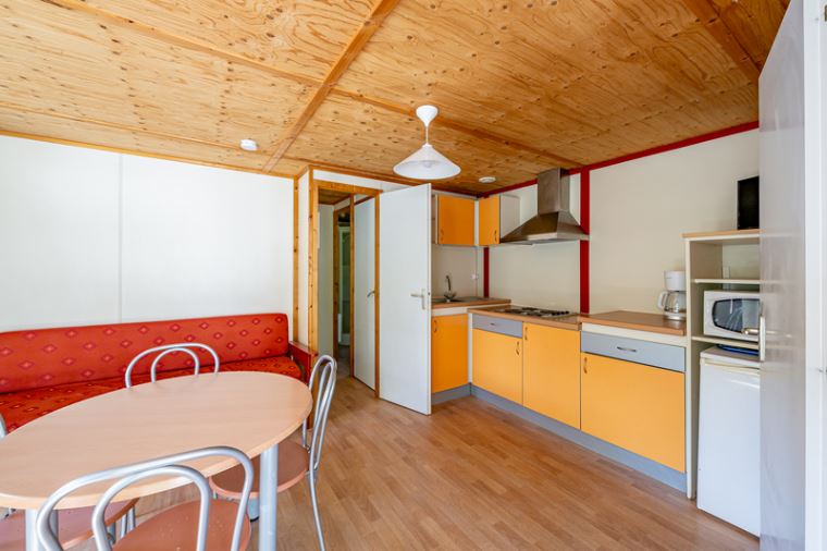 Coin salon/cuisine : cuisine équipée (évier, plaques électriques, réfrigérateur, cafetière, micro-ondes, vaisselle), télévision, chauffage.