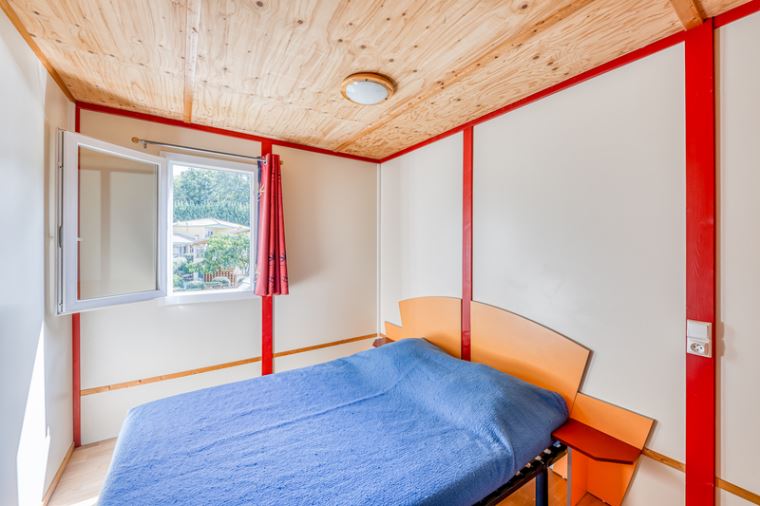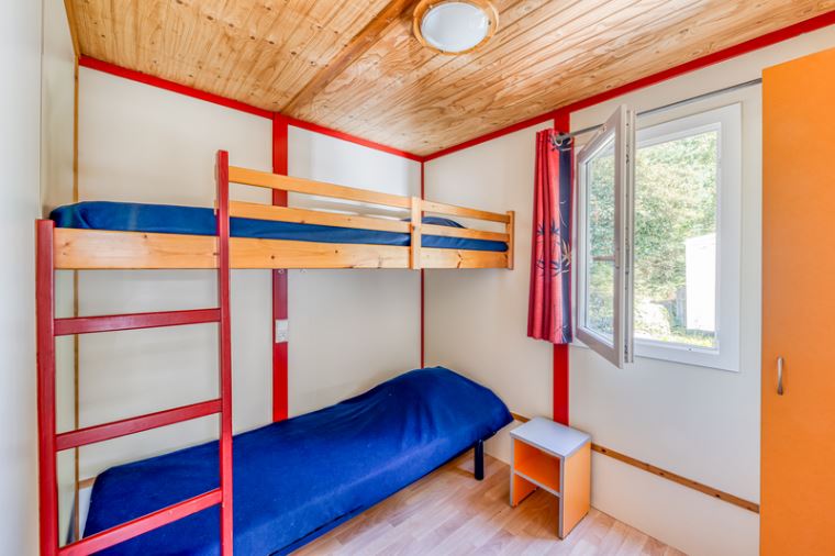 Coin nuit : une chambre avec 1 lit double (140×190), une chambre avec 2 lits simples (90X190) superposés, oreillers et couvertures fournis.