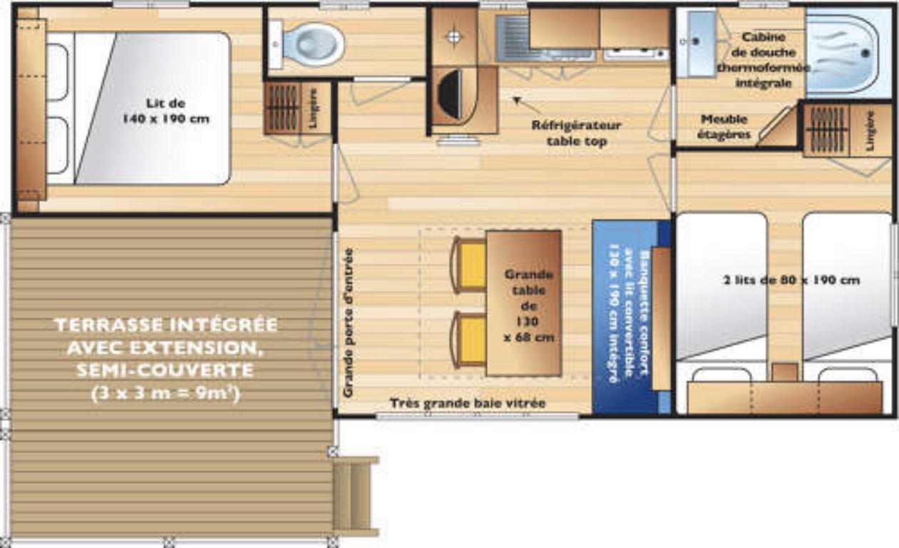 Coin nuit : une chambre avec 1 lit double (140×190), une chambre avec 2 lits simples (90×190) côte à côte, oreillers et couvertures fournis.