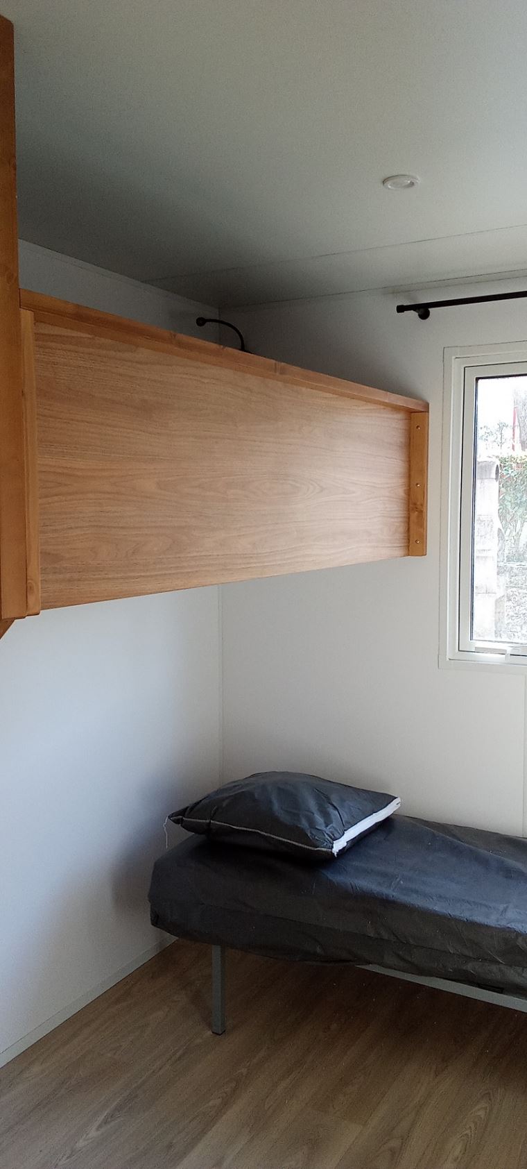 Coin nuit : une chambre avec 1 lit double (140×190), une chambre avec 2 lits simples (90X190) côte à côte, oreillers et couvertures fournis.