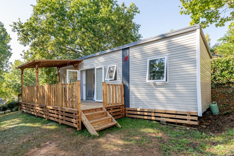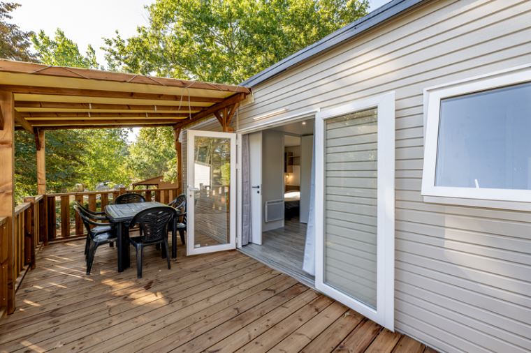 Extérieur : terrasse semi-couverte avec salon de jardin.