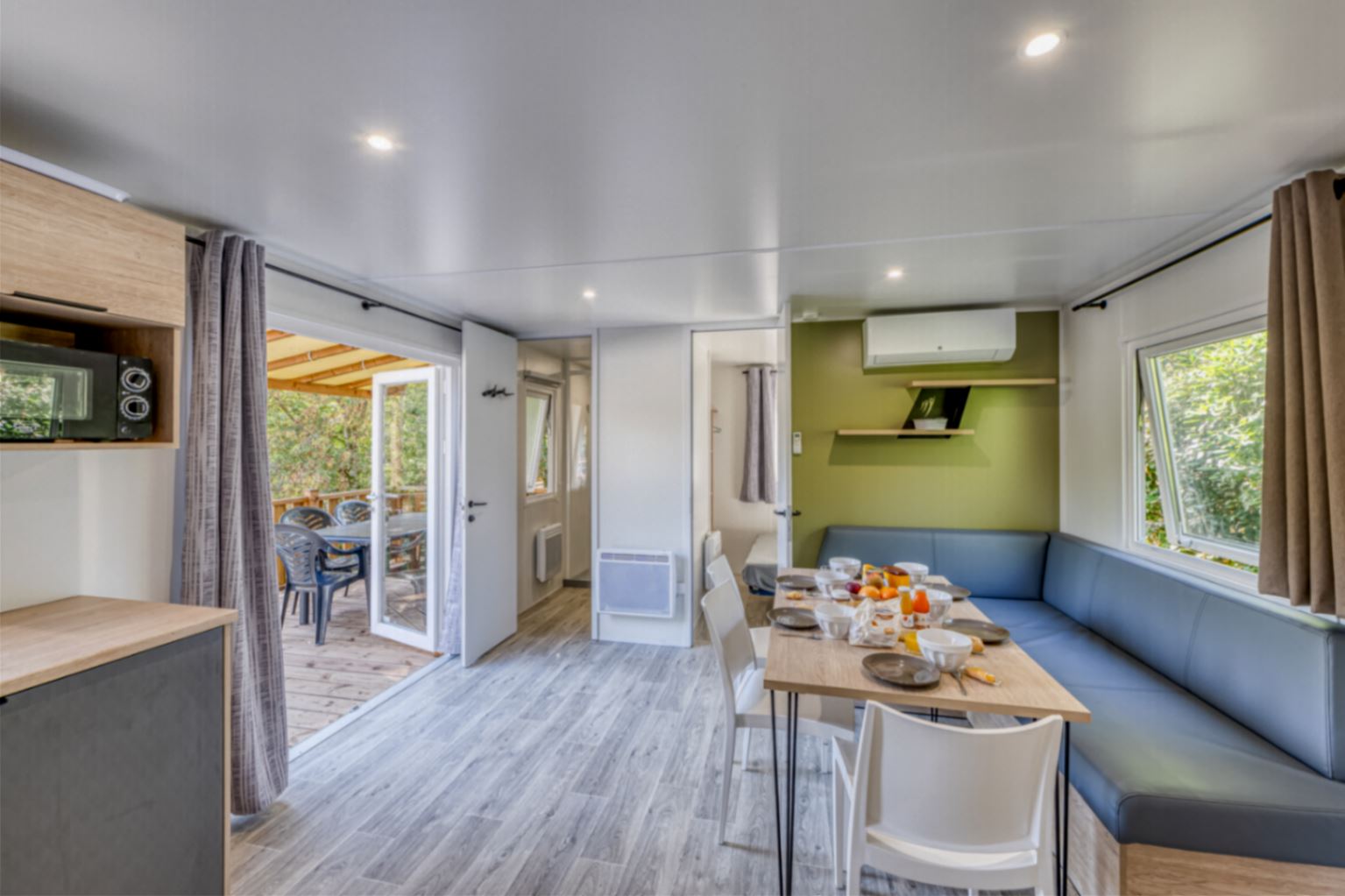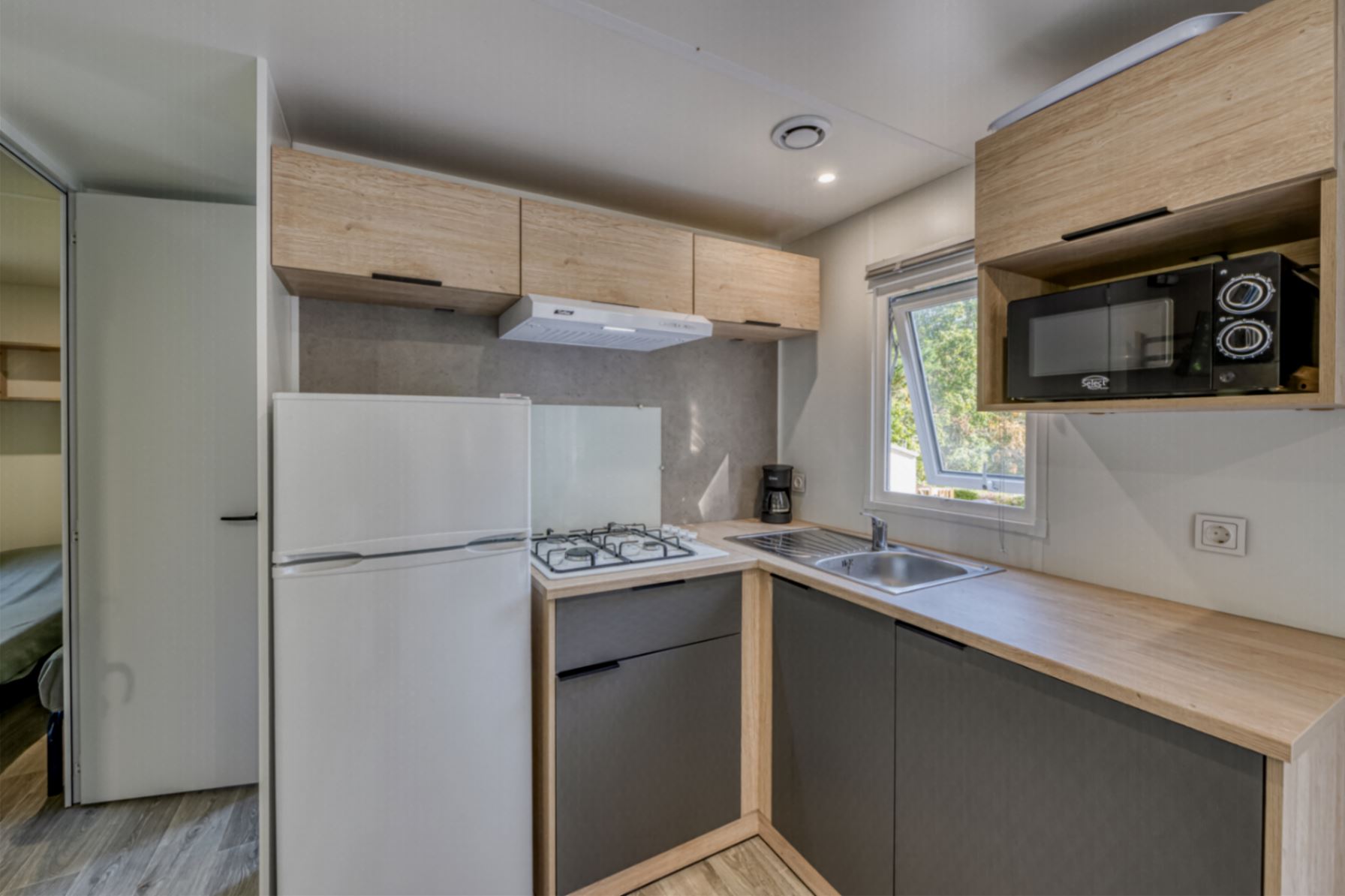 Coin salon/séjour : cuisine équipée (évier, feux gaz, réfrigérateur-congélateur, micro-ondes, cafetière, vaisselle), climatisation, chauffage et télévision.
